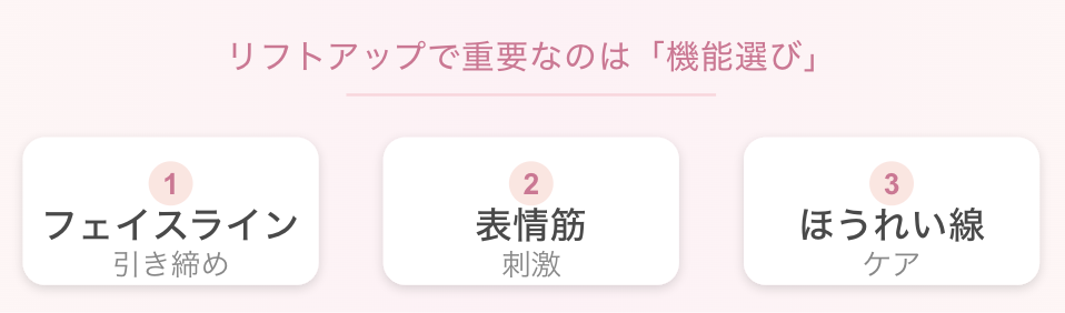 特にリフトアップの場合は、「リフトアップに特化した機能」があるかどうかでユーザーの満足度も大きく違っていました。