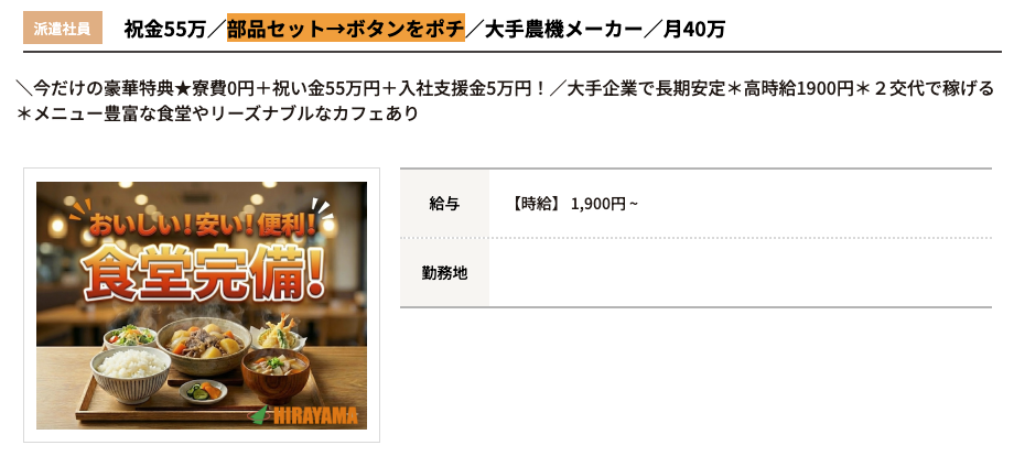時給1900円以上、祝金有、寮費0円