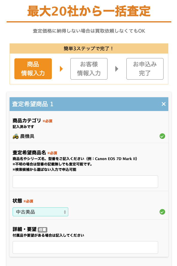 • フォームに農機具の情報(型式・年式など)を入力して依頼するだけ。