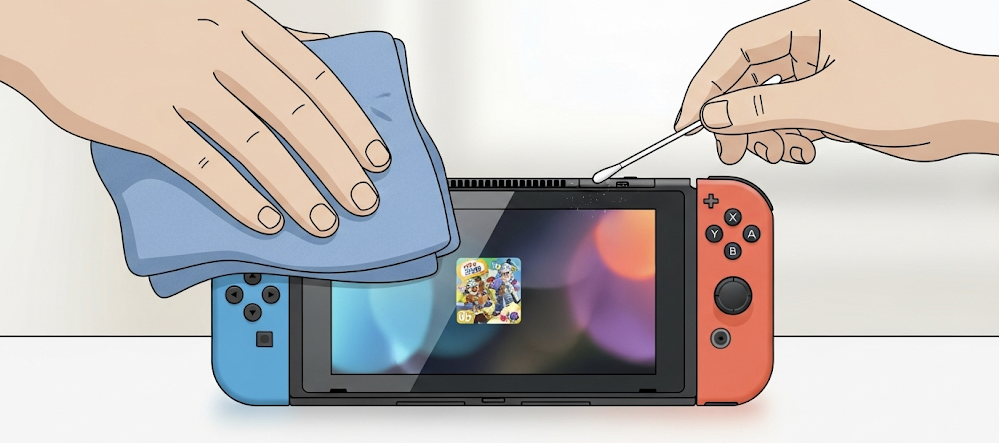 商品の見た目は査定時の印象を大きく左右します。 本体の画面や、Joy-Conのスティック周り、ドックの端子部分など、ホコリや汚れが溜まりやすい部分を丁寧に清掃しましょう。柔らかい布や綿棒を使うのがおすすめです。